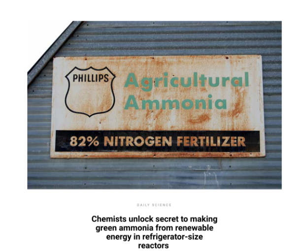 100年前,氨帮助农业革命,并为世界上日益增长的人口提供了粮食。氨是肥料的主要成分,当今世界粮食生产的一半都依赖氨。但是,氨却有着巨大的碳足迹,生产一公吨氨导致两倍的二氧化碳排放。